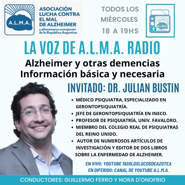 Entrevista al Dr. Julian Bustin. Médico Psiquiatra, especializado en Gerontopsiquiatría. Además, es el Jefe de Gerontopsiquiatría de INECO, y profesor de Psiquiatría en la Universidad Favaloro. Es miembro del Colegio Real de Psiquiatras del Reino Unido, autor de numerosos artículos de investigación y editor de dos libros sobre la Enfermedad de Alzheimer.