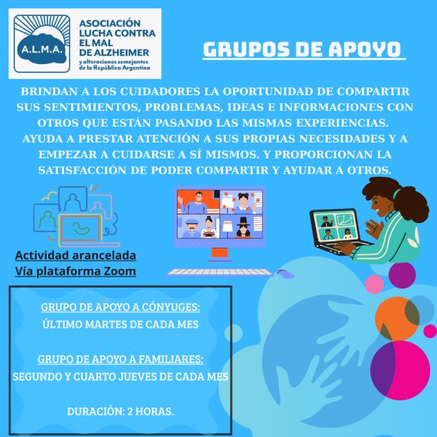 Los grupos de apoyo a cónyuges y familiares de A.L.M.A., brindan a estos cuidadores la oportunidad de compartir sus sentimientos, problemas, ideas e informaciones con otros que están pasando las mismas experiencias. Ayuda a prestar atención a sus propias necesidades y a empezar a cuidarse a sí mismos. También proporciona la satisfacción de poder compartir y ayudar a otros. La función de nuestros grupos es el apoyo mutuo.