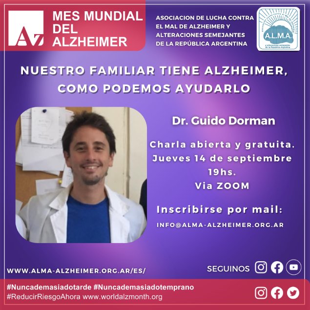 En esta oportunidad, invitamos a la comunidad a participar de la segunda charla por el Mes Mundial del Alzheimer 2023, a cargo del Dr. Guido Dorman, Neurólogo especialista en Neurología Cognitiva, Investigador y Médico Neurólogo en Fundación INECO y Fundación Favaloro, Docente en la Facultad de Medicina de la UBA, Médico Neurólogo en el Hospital Ramos Mejía.